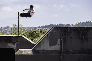 Sean Keane poles stalls back into the bank while filming for Rollerblades video Series 'In Motion SF' in San Francisco, California.